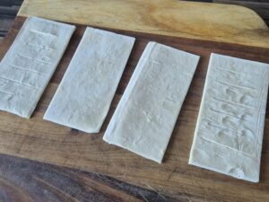 - Snijd elk plakje bladerdeeg doormidden, zodat je vier rechthoeken hebt.