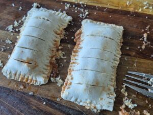 - Dek af met de ingesneden plakjes en druk de randen stevig aan met een vork. Denk aan een ouderwetse envelop – geen lekken toegestaan.