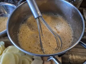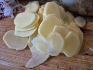 - Eerst de aardappelen schillen en in ca. 3 tot 5 mm dikke schijfjes snijden, liefst met een mandoline.