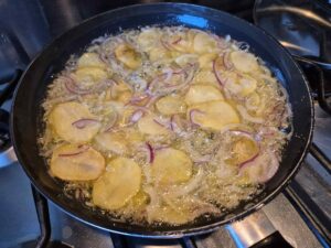 - Doe na 5 minuten – of als de aardappels goudbruin zijn – de uien erbij. Deze heb je in dunne, halve ringen hebt gesneden terwijl de aardappeltjes aan het bakken waren. Dit is de snelste workflow. Je kunt ook op je gemakkie alles snijden en klaarzetten. Zet het vuur lager en laat zachtjes garen.