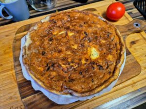 - Laat de tortilla op een bord glijden – liefst met bakpapier, dan kleeft het niet aan het bord. Laat een minuutje of vijf afkoelen. Eet smakelijk!