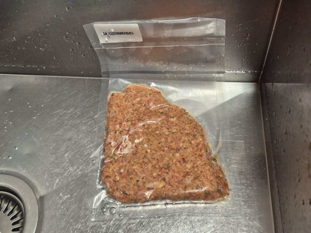 Op de foto bovenaan deze foodblog, zie je hoe ik mijn gehaktmengsel voor saucijzenbroodjes ontdooi, onder water. Ik vries de speciaal gekruide gehakt gevacumeerd in, per twee porties. 120 gram voor twee saucijzenbroodjes ontdooit in minder dan 10 minuutjes. Let op hoe plat ik het heb ingevroren; dan ontdooit het nóg sneller.