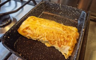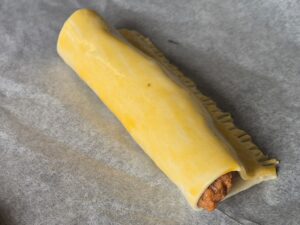 - Leg het bladerdeeg met de glimmende kant naar boven (dat is de kant waar het plastic op zat). Leg een rolletje gehakt in het midden en vouw het deeg dicht. Maak de randen nat met water en druk ze aan met een vork. Zo krijg je dat klassieke patroon.